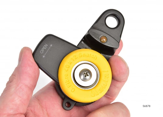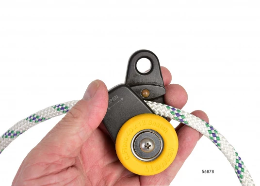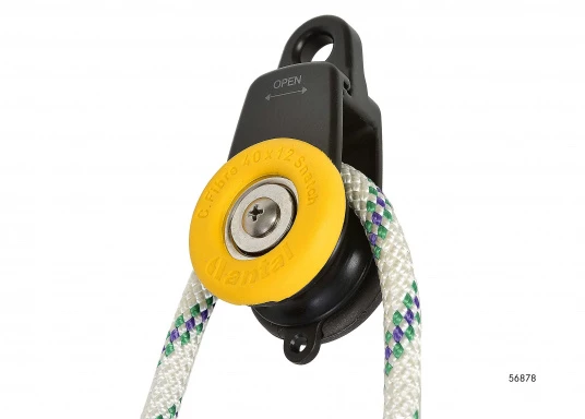 Poulie ouvrante antal à ouverture d’une main par rotation d’une joue. Verrouillage automatique à la fermeture.