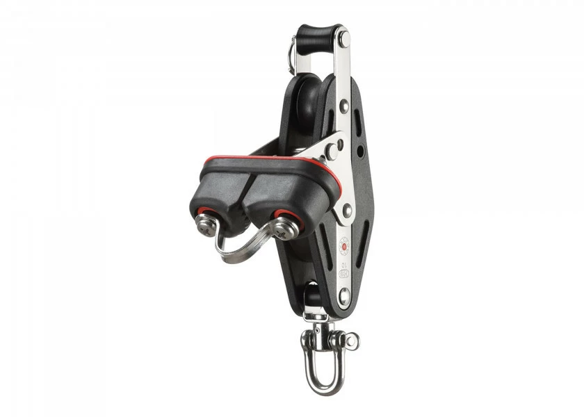 Poulies violon doubles à émerillon, taquet coinceur et ringot. Leurs joues sont fabriquées en résine Hostaform C haute qualité, résistante à l’eau de mer, et indéformables. les fixations, boulons et rivets sont en acier inox.